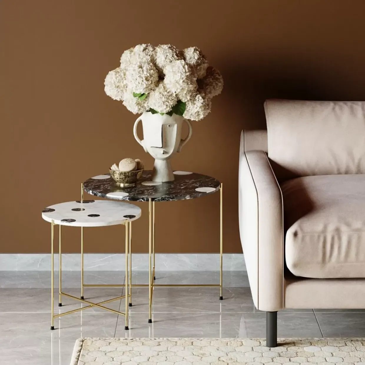- Runde Beistelltische Im 2Er Set Mit Tischplatten Aus Kunstharz Und Gestellen In Gold