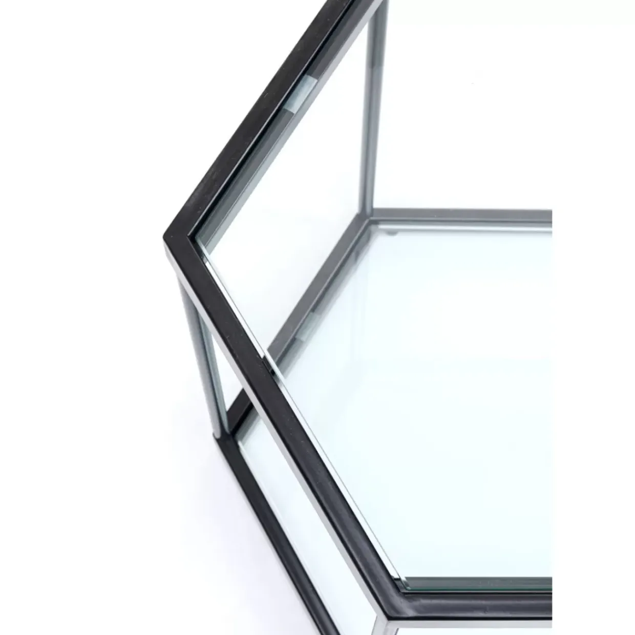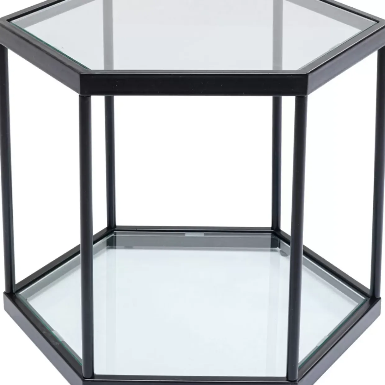 - Glamour Mit Modernem Touch: Sechseckiger Glas-Couchtisch Mit Schwarzem Stahlgestell Und Zwei Ablageflachen