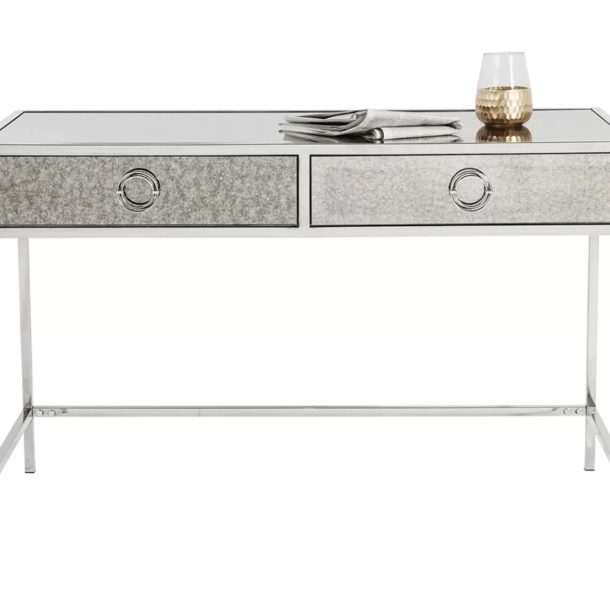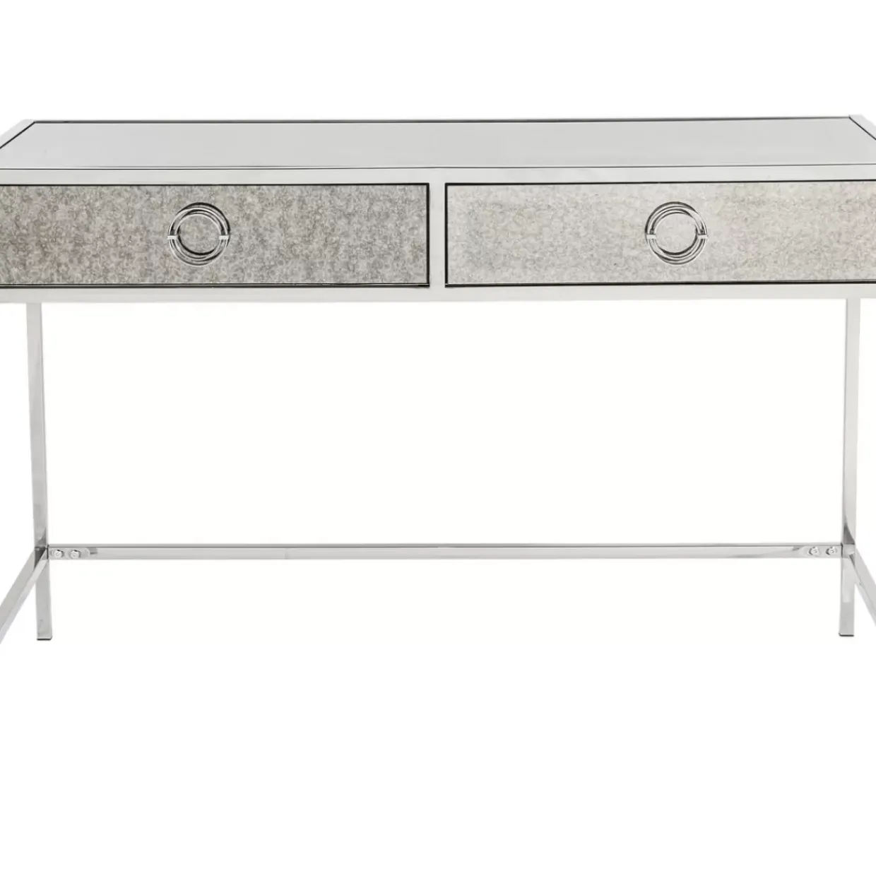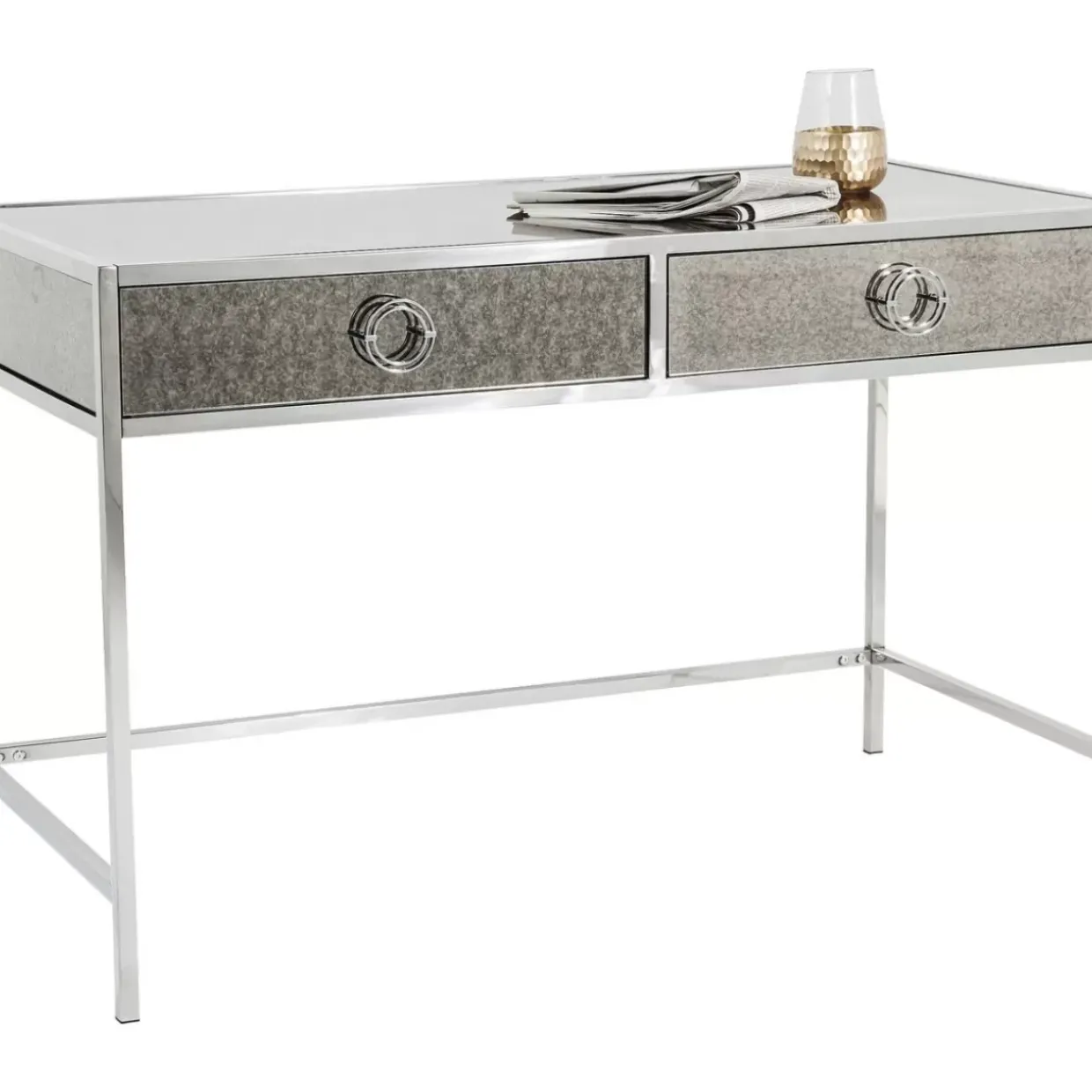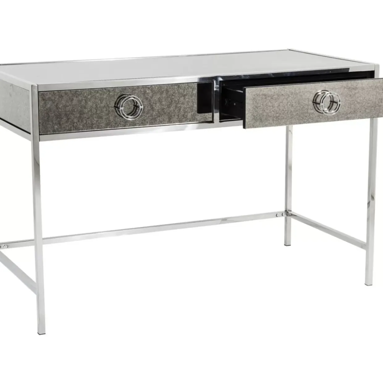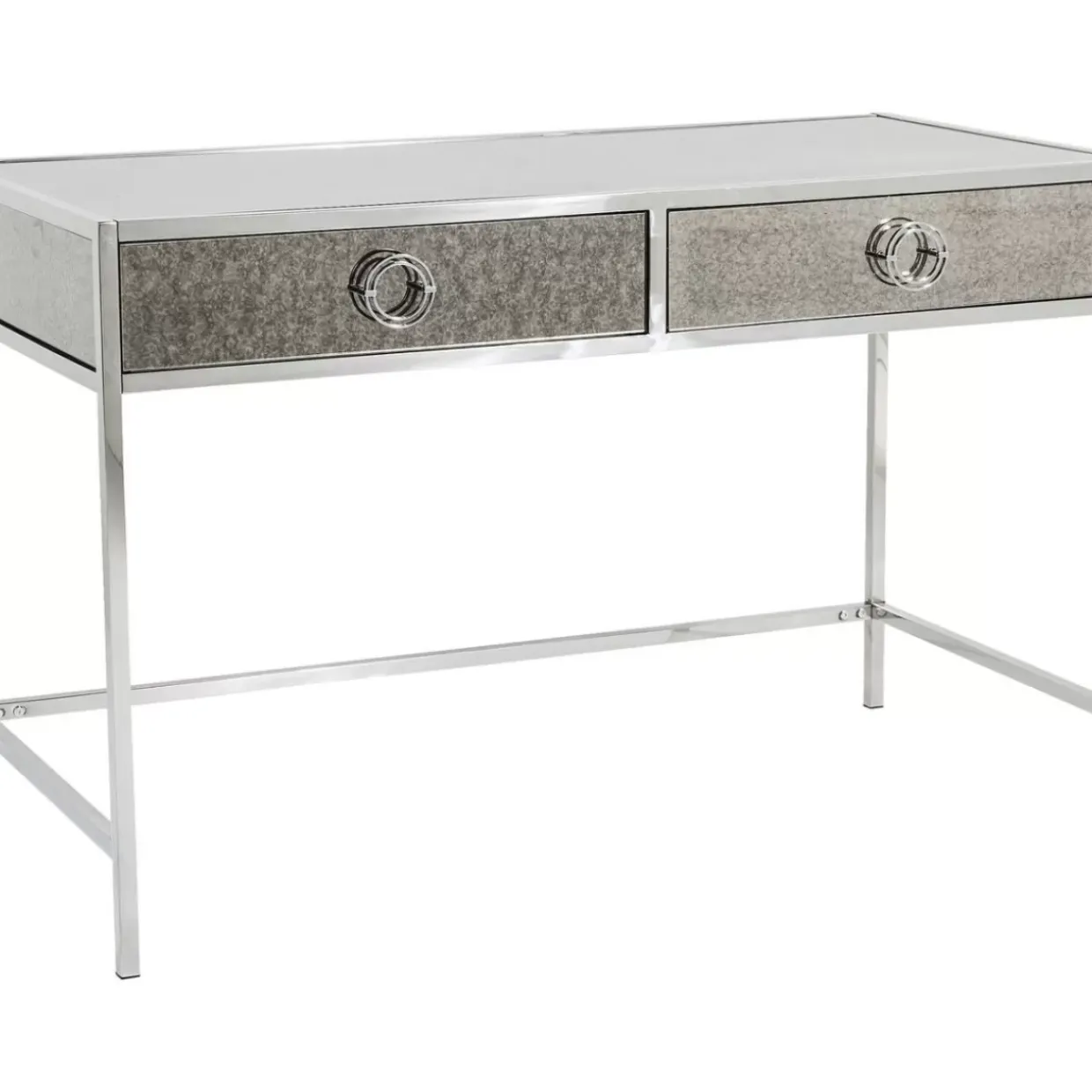 - Schreibtisch Mit Grau-Melierter Spiegelglas-Verkleidung Im Antik Look,Zwei Schubladen Und Einem Silber-Glanzendem Stahl-Gestell
